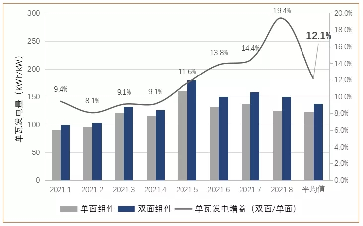 我們獲取了該項(xiàng)目從2021年1月到2021年8月共計(jì)8個(gè)月的發(fā)電數(shù)據(jù),為了評(píng)估項(xiàng)目的發(fā)電效果,選取了鄰近305Wp常規(guī)單晶組件的電站做參照。通過(guò)兩個(gè)電站各月單瓦發(fā)電量的對(duì)比,隆基雙面組件相比常規(guī)單晶組件每瓦發(fā)電量高12.1%。