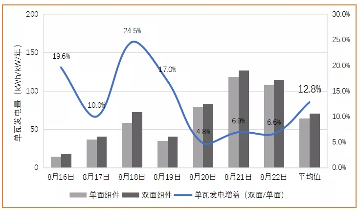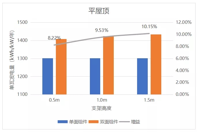 雙面組件常規(guī)應(yīng)用以水泥平屋頂居多,前文仿真分析及實(shí)證電站數(shù)據(jù)基本吻合,雙面組件比單面組件多發(fā)11%左右。