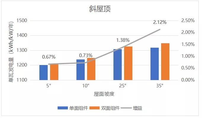 可以看到,在彩鋼瓦屋面平鋪時(shí)(5°~10°的坡度),雙面首年增益有0.7%左右;在斜屋頂平鋪時(shí)(25°~35°的坡度),雙面首年增益約1%~2%