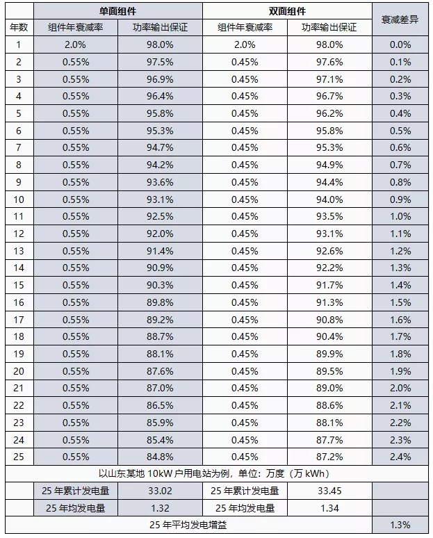 所以雙面組件相比單面組件有0.1%的逐年衰減優(yōu)勢(shì),以山東10kW電站為例,25年平均多發(fā)電1.3%。