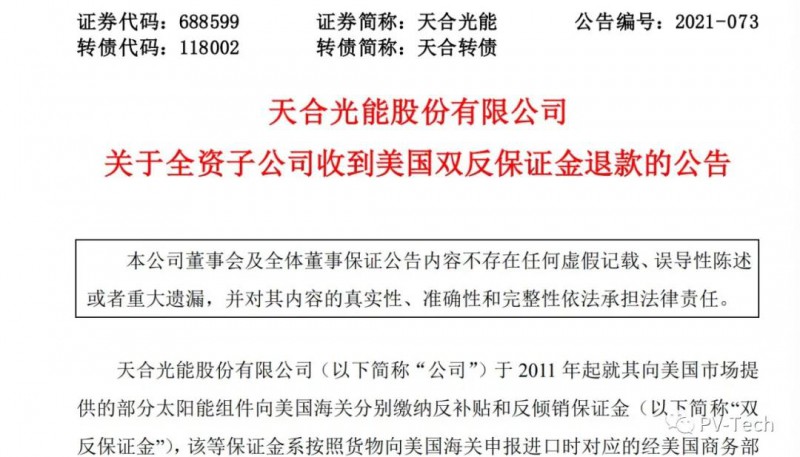 11月11日晚間,天合光能(688599.SH)發(fā)布公告稱,全資子公司Trina Solar (U.S.)收到美國雙反保證金退款合計(jì)1.756億美金,公司因利息所得將增加2021年度凈利潤約1.5億元人民幣。
