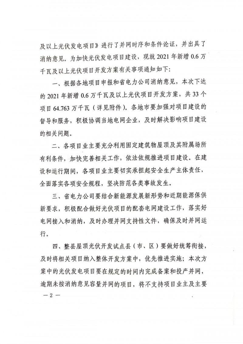 本次下達2021年新增0.6萬千瓦及以上光伏項目開發(fā)方案,共33個項目64.763萬千瓦。