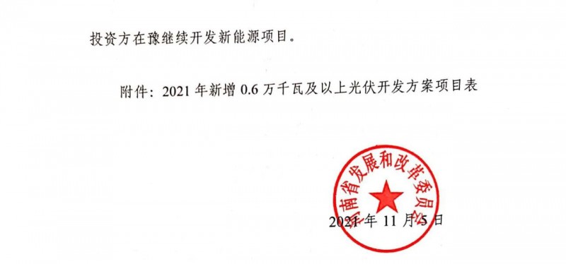 11月5日,河南省發(fā)改委下發(fā)《關(guān)于下達 2021年新增0.6萬千瓦及以上光伏項目開發(fā)方案的通知》。文件指出,對于不新增用地、利用固定建筑物及其附屬場所建設的光伏項目,不限申報規(guī)模!
