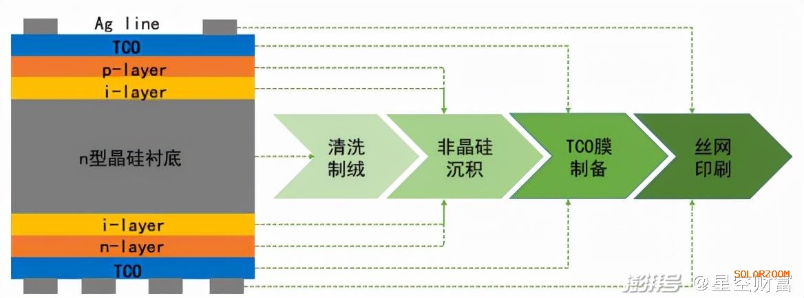 HJT本質上是一種光伏單晶電池片。HJT電池是雙面電池結構,最中間是N型晶體硅,在晶體硅其中一面依次沉積本征非晶硅薄膜和P型薄膜,就形成了P-N結(功能是把光能轉化成電能)。由于非晶硅的導電性比較差,需要再在電池兩側沉積透明導電薄膜(TCO)來進行導電,最后采用絲網(wǎng)印刷技術形成雙面電極。