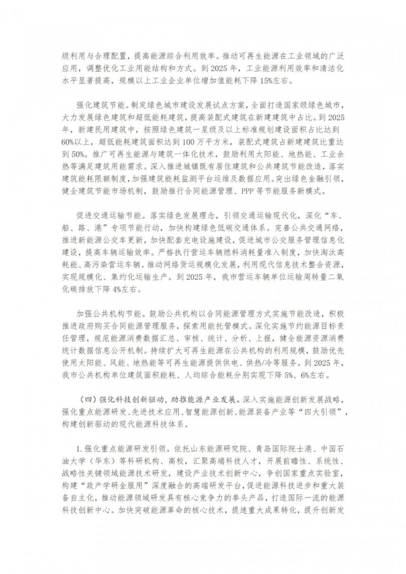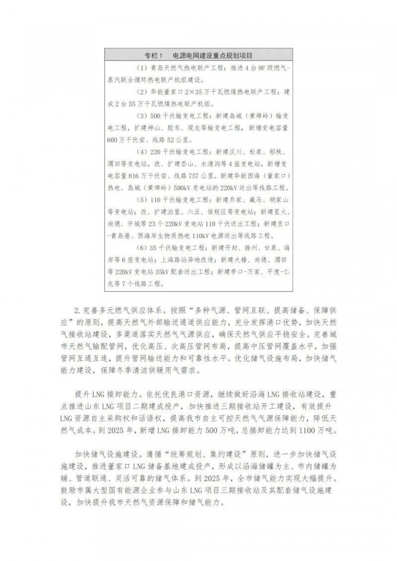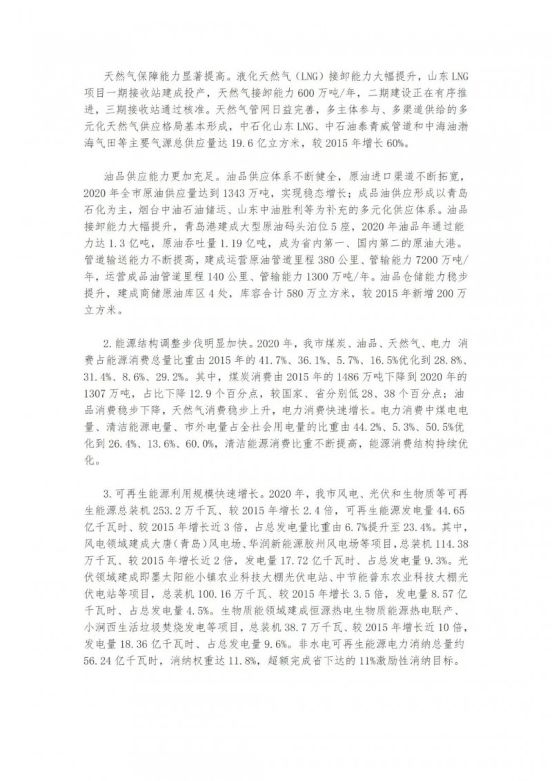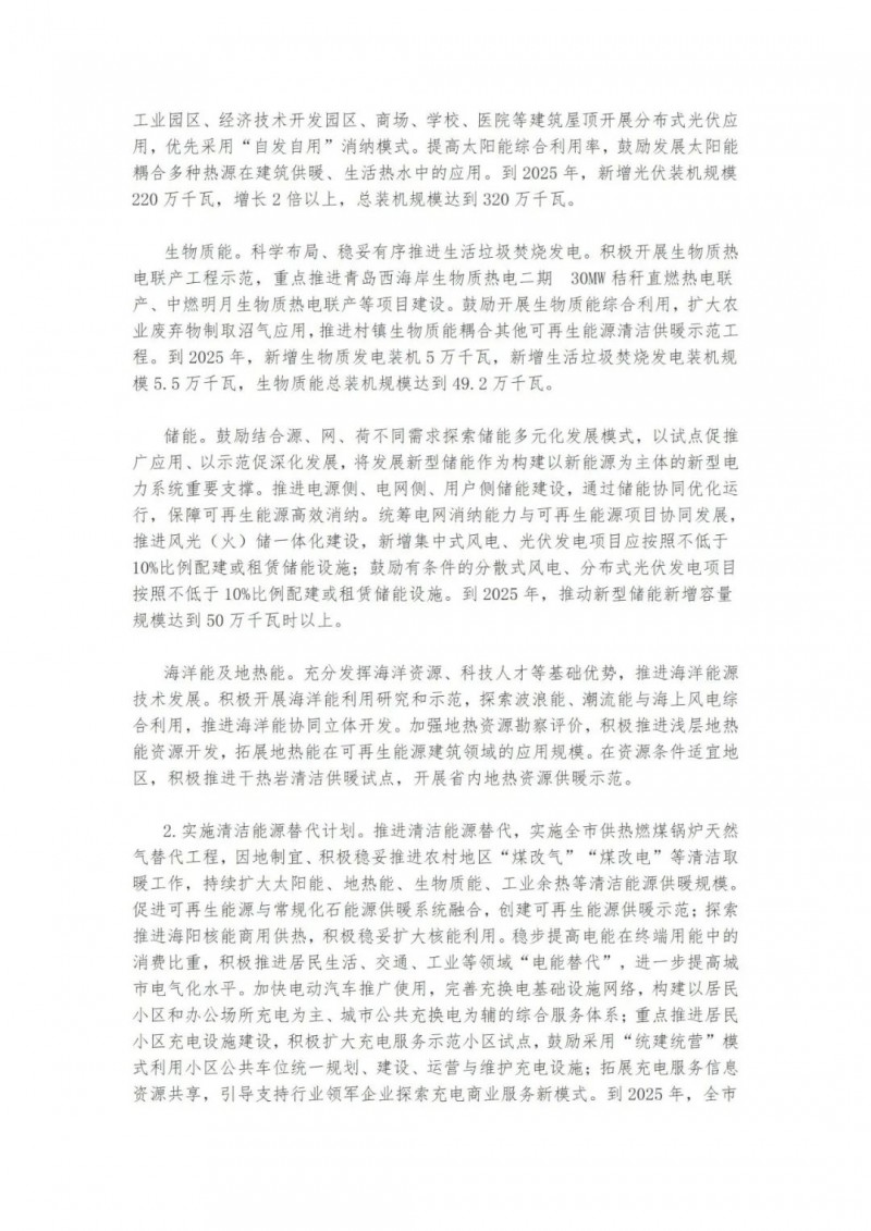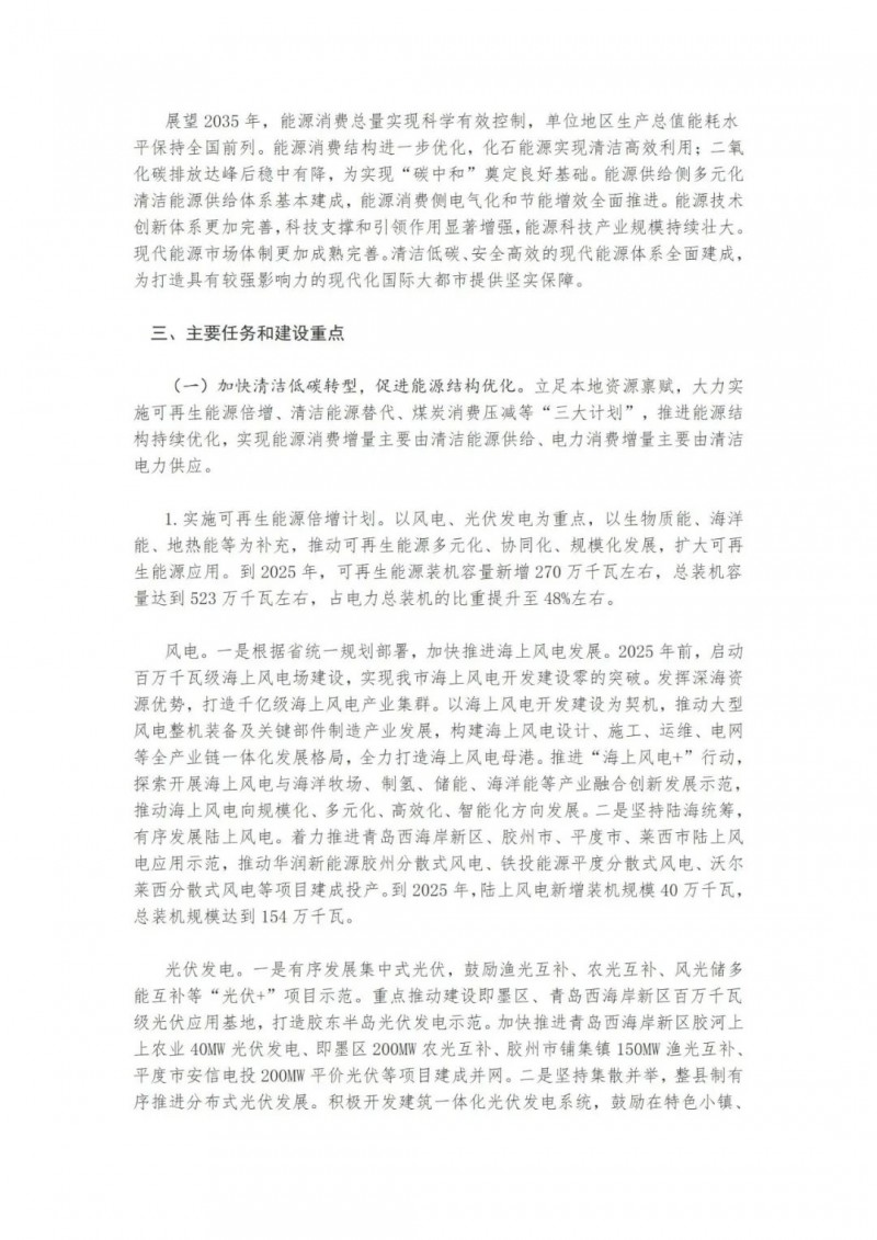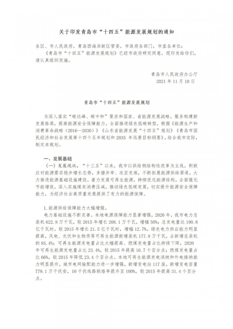近日,山東青島市人民政府辦公廳印發(fā)了《關(guān)于印發(fā)青島市“十四五”能源發(fā)展規(guī)劃的通知》。提出了青島市“十四五”能源發(fā)展的主要任務和建設重點。實施可再生能源倍增計劃。以風電、光伏發(fā)電為重點,以生物質(zhì)能、海洋能、地熱能等為補充。到2025年,可再生能源裝機容量新增270萬千瓦左右,總裝機容量達到523萬千瓦左右,占電力總裝機的比重提升至48%左右。