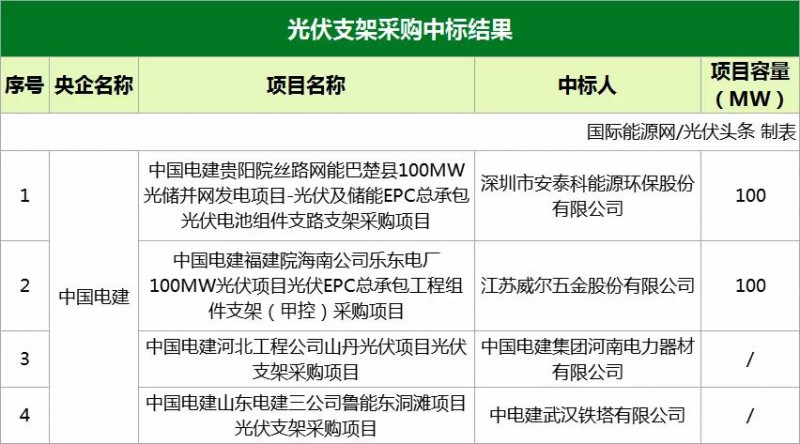 光伏支架采購(gòu)入圍企業(yè)有深圳市安泰科能源環(huán)保股份有限公司、江蘇威爾五金股份有限公司、中國(guó)電建集團(tuán)河南電力器材有限公司、中電建武漢鐵塔有限公司。