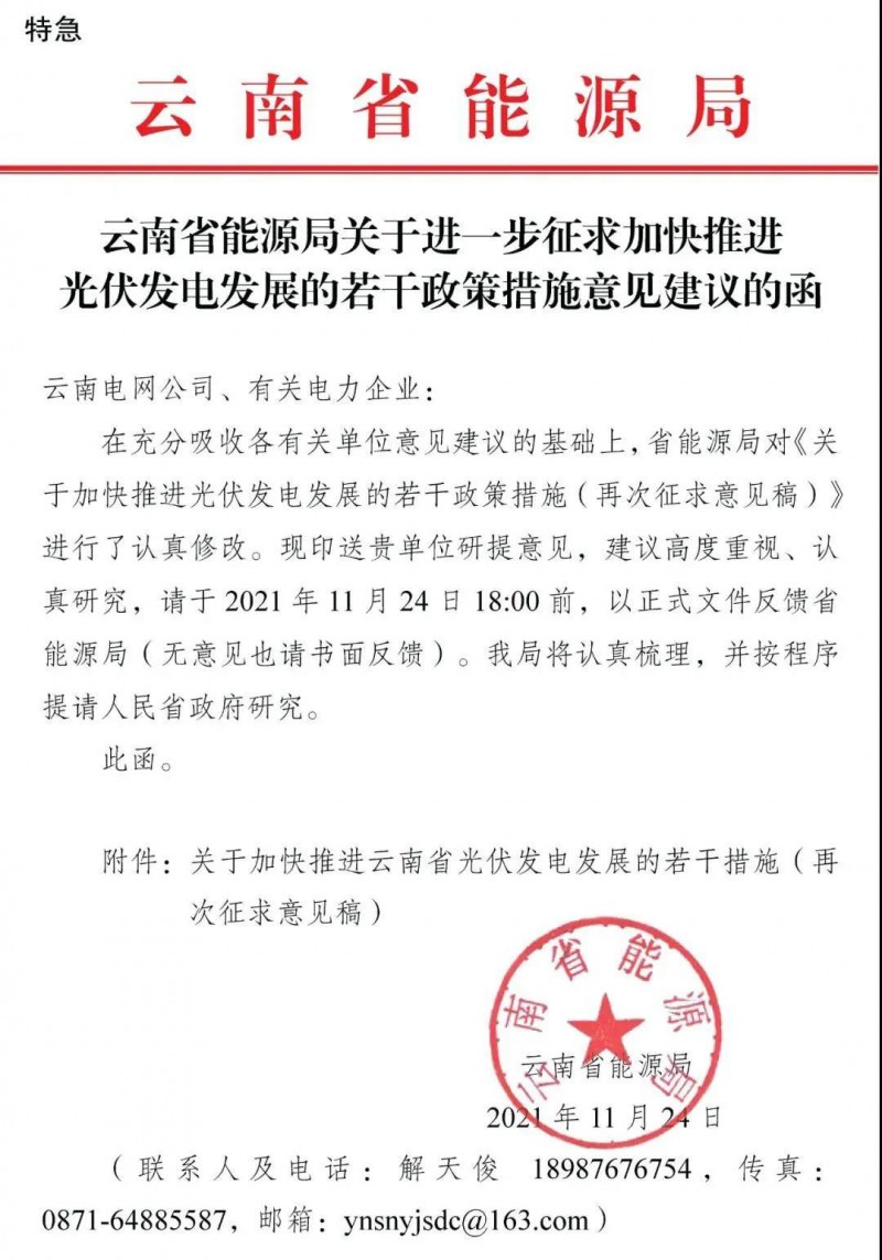 11月24日,云南省能源局下發(fā)《關(guān)于進(jìn)一步加快推進(jìn)光伏發(fā)電發(fā)展的若干政策措施意見建議的函》,就云南光伏光伏給出指導(dǎo)意見。