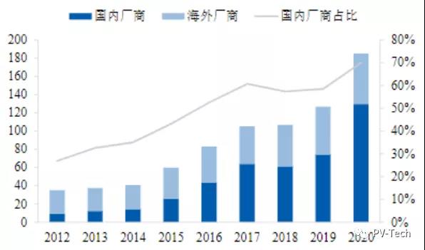 除了頭部企業(yè)外,國(guó)內(nèi)逆變器廠商崛起的另一個(gè)佐證則是近年來(lái)出貨占比的不斷提升,根據(jù)Wood Mackenzie的數(shù)據(jù)統(tǒng)計(jì),2012年國(guó)內(nèi)廠商的出貨量在全球的占比不到30%,到2020年這一數(shù)據(jù)已攀升至70%。