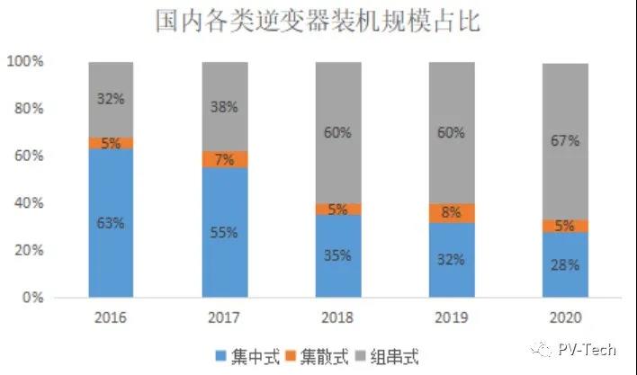 組串式逆變器的市占增長(zhǎng)一方面得益于分布式光伏的不斷發(fā)展,另一方面則是由于組串式逆變器在大型地面電站的應(yīng)用越來(lái)越普遍。