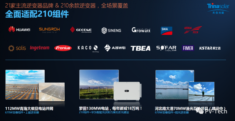 此外在系統(tǒng)適配性上,張映斌博士表示,目前已經(jīng)有21家主流逆變器廠商210余款產(chǎn)品以及14家全球跟蹤支架匹配全面適配天合210至尊系列超高功率組件。