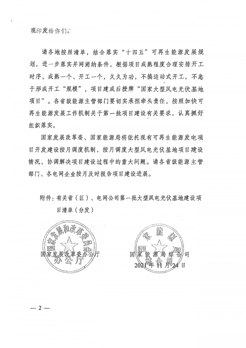 根據(jù)文件,請各地按照清單,結(jié)合落實(shí)“十四五”可再生能源發(fā)展規(guī)劃,進(jìn)一步落實(shí)并網(wǎng)消納條件,根據(jù)項(xiàng)目成熟程度合理安排開工時序,成熟一個、開工一個,久久為功,不搞運(yùn)動式開工,不急于形成開工“規(guī)模”,項(xiàng)目建成后授牌“國家大型風(fēng)電光伏基地項(xiàng)目”。各省級能源主管部門要切實(shí)承擔(dān)牽頭責(zé)任,按照加快可再生能源發(fā)展工作機(jī)制關(guān)于第一批項(xiàng)目建設(shè)有關(guān)要求,認(rèn)真抓好組織落實(shí)。