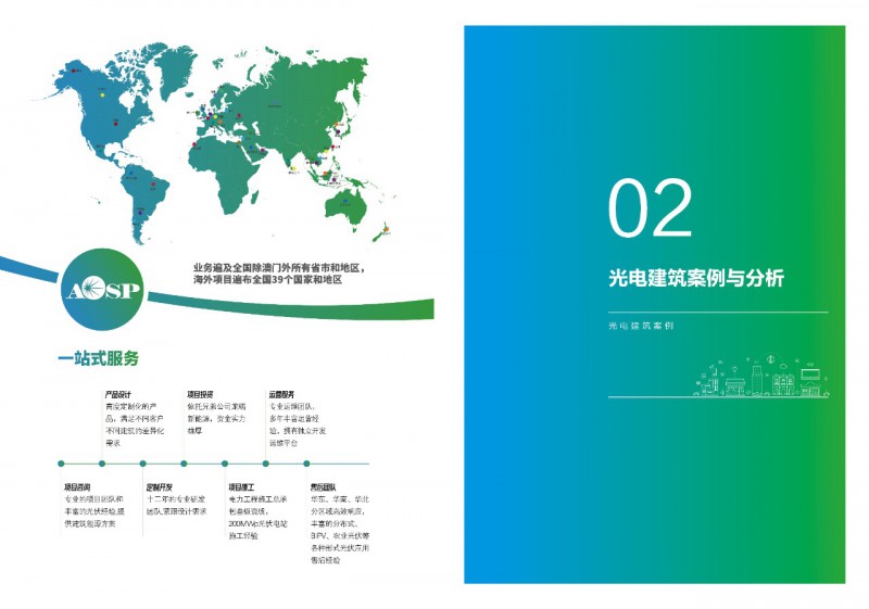 《案例集》分析和總結(jié)我國(guó)光電建筑應(yīng)用現(xiàn)狀、國(guó)內(nèi)外發(fā)展趨勢(shì)、技術(shù)要點(diǎn)等內(nèi)容,為行業(yè)發(fā)展提供基礎(chǔ)數(shù)據(jù)。經(jīng)過(guò)案例篩選,共收錄了105項(xiàng)光電建筑典型案例,涵蓋了我國(guó)工業(yè)建筑、公共建筑、辦公建筑、商業(yè)建筑、居住建筑及其他建筑類(lèi)型光伏應(yīng)用,為光伏在建筑上大規(guī)模應(yīng)用提供了依據(jù)和參考價(jià)值。