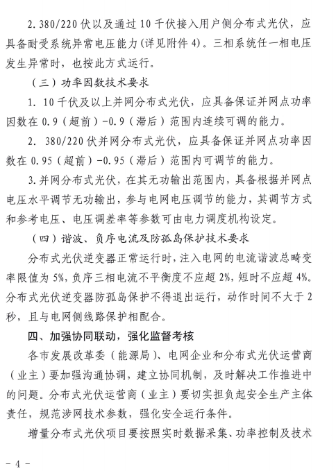 近日,國家能源局山東監(jiān)管辦公室 山東省能源局發(fā)布關(guān)于切實(shí)做好分布式光伏并網(wǎng)運(yùn)行工作的通知,通知指出四點(diǎn),一、加強(qiáng)接入能力評估,做好分布式光伏接網(wǎng)工作;二、強(qiáng)化安全運(yùn)行條件,實(shí)現(xiàn)分布式光伏精準(zhǔn)監(jiān)控調(diào)度;三、規(guī)范涉網(wǎng)技術(shù)參數(shù),保證分布式光伏并網(wǎng)性能;四、加強(qiáng)協(xié)同聯(lián)動,強(qiáng)化監(jiān)督考核。