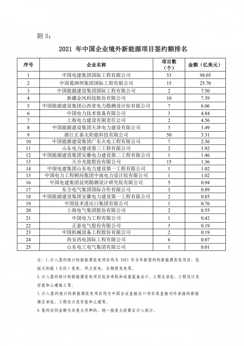 據(jù)了解,計入簽約統(tǒng)計的新能源發(fā)電項目包含單機和成套裝備出口、工程總承包、工程設(shè)計及安裝和土建施工等;新能源發(fā)電項目均為中國企業(yè)直接出口項目或直接對外承接的新能源總承包、工程設(shè)計及安裝和土建等。
