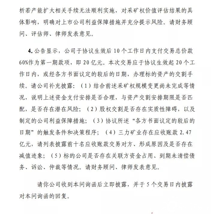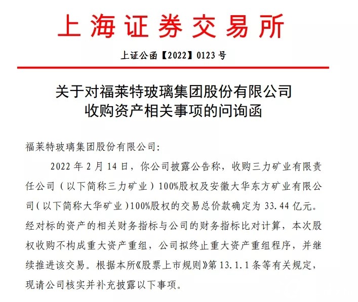 上交所近期發(fā)布問(wèn)詢(xún)函,就光伏玻璃巨頭福萊特對(duì)三力礦業(yè)、安徽大華東方礦業(yè)等100%股權(quán)的收購(gòu)案進(jìn)行問(wèn)詢(xún),兩項(xiàng)收購(gòu)額總計(jì)為33.44億。