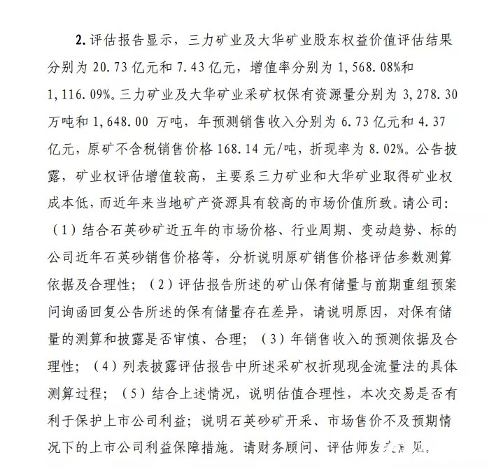 同時(shí),上交所也指出,上述兩家(擬被收購(gòu))公司的股東權(quán)益價(jià)值評(píng)估結(jié)果分別為20.73億和7.43億,增值率為1568%和1116%,兩家公司的年預(yù)測(cè)銷(xiāo)售收入為6.73億和4.37億,請(qǐng)福萊特對(duì)石英砂礦的近五年市場(chǎng)價(jià)、行業(yè)周期、變動(dòng)趨勢(shì)和標(biāo)的公司近年來(lái)石英砂銷(xiāo)售價(jià)等,分析說(shuō)明原礦銷(xiāo)售價(jià)評(píng)估參數(shù)測(cè)算依據(jù)及合理性。同時(shí)也說(shuō)明年銷(xiāo)售收入的預(yù)測(cè)依據(jù)、估值的合理性等。