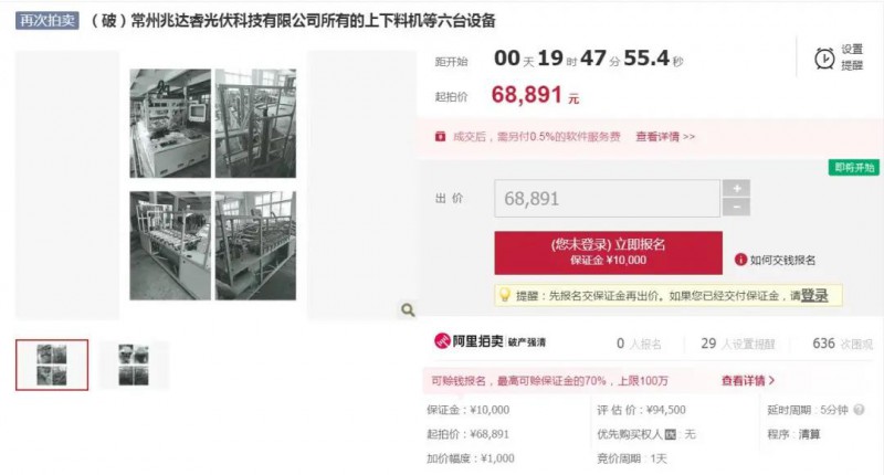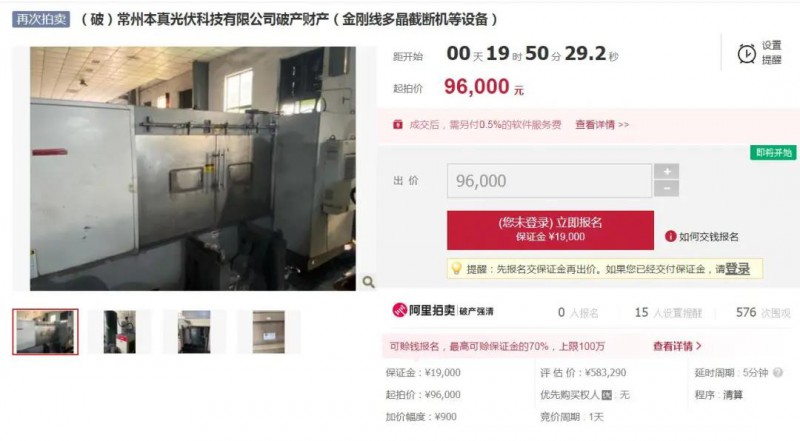 近日,一批土地使用權(quán)、光伏電站機(jī)器設(shè)備及金剛線(xiàn)多晶截?cái)鄼C(jī)、上下料機(jī)、太陽(yáng)能晶片計(jì)數(shù)儀等光伏設(shè)備即將在阿里司法拍賣(mài)平臺(tái)進(jìn)行拍賣(mài)。