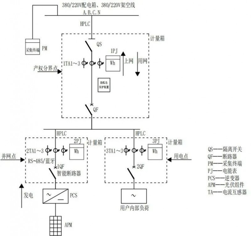 要實(shí)現(xiàn)上述目標(biāo),低壓分布式光伏計(jì)量采集需要安裝的主要設(shè)備包括:采集終端、智能電能表、電流互感器、智能斷路器、防/反孤島保護(hù)裝置等