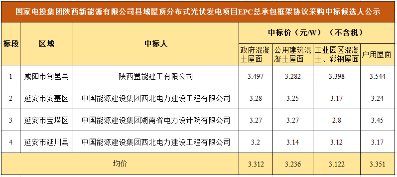 3月2日,國(guó)家電投集團(tuán)陜西新能源有限公司縣域屋頂分布式光伏發(fā)電項(xiàng)目EPC總承包框架協(xié)議采購(gòu)中標(biāo)候選人公示。項(xiàng)目合計(jì)規(guī)模為213MW,陜西置能建工有限公司中標(biāo)咸陽(yáng)市旬邑縣12MW屋頂分布式項(xiàng)目,中能建三個(gè)子公司中標(biāo)剩余201MW項(xiàng)目。所有項(xiàng)目均價(jià)為3.26元/W。