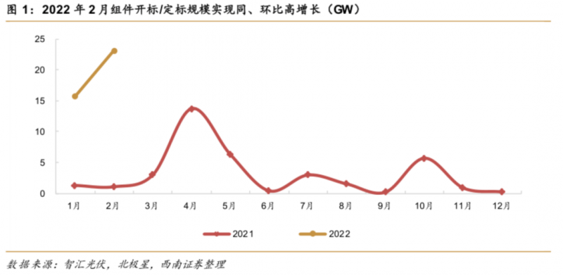 地面電站裝機(jī)需求釋放,央國企組件開標(biāo)熱潮開啟。2021年12月上旬硅片庫存去化、產(chǎn)業(yè)鏈價格回落,地面電站的組件招標(biāo)逐步啟動;疊加部分項目延期、補(bǔ)裝組件等因素,2022開年來終端需求呈現(xiàn)爆發(fā)式增長。根據(jù)我們統(tǒng)計,2022年1-2月,以央國企為主的組件開標(biāo)/定標(biāo)規(guī)模已達(dá)38.9GW??紤]到統(tǒng)計信息的不完全性,實際開標(biāo)/定標(biāo)規(guī)模有望達(dá)到40GW,終端需求表現(xiàn)強(qiáng)勢。