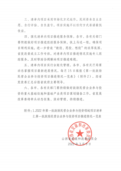 3月14日,山西省發(fā)改委關(guān)于發(fā)布2022年第一批鼓勵民營企業(yè)參與投資領(lǐng)域項目清單的通知,按照山西省委省政府關(guān)于實施市場主體倍增工程重要部署,為進一步放寬民營企業(yè)市場準入,鼓勵引導(dǎo)省內(nèi)外民間資本投資山西、建設(shè)山西,經(jīng)報請省政府同意,現(xiàn)將2022年第一批鼓勵民營企業(yè)參與投資領(lǐng)域項目清單(共50個項目,含打包項目)予以發(fā)布。本次發(fā)布的領(lǐng)域和項目主要面向民營企業(yè),所有項目(包含子項目)民企投資比例不得低于30%,此次在新能源領(lǐng)域中,共有4個項目入選。