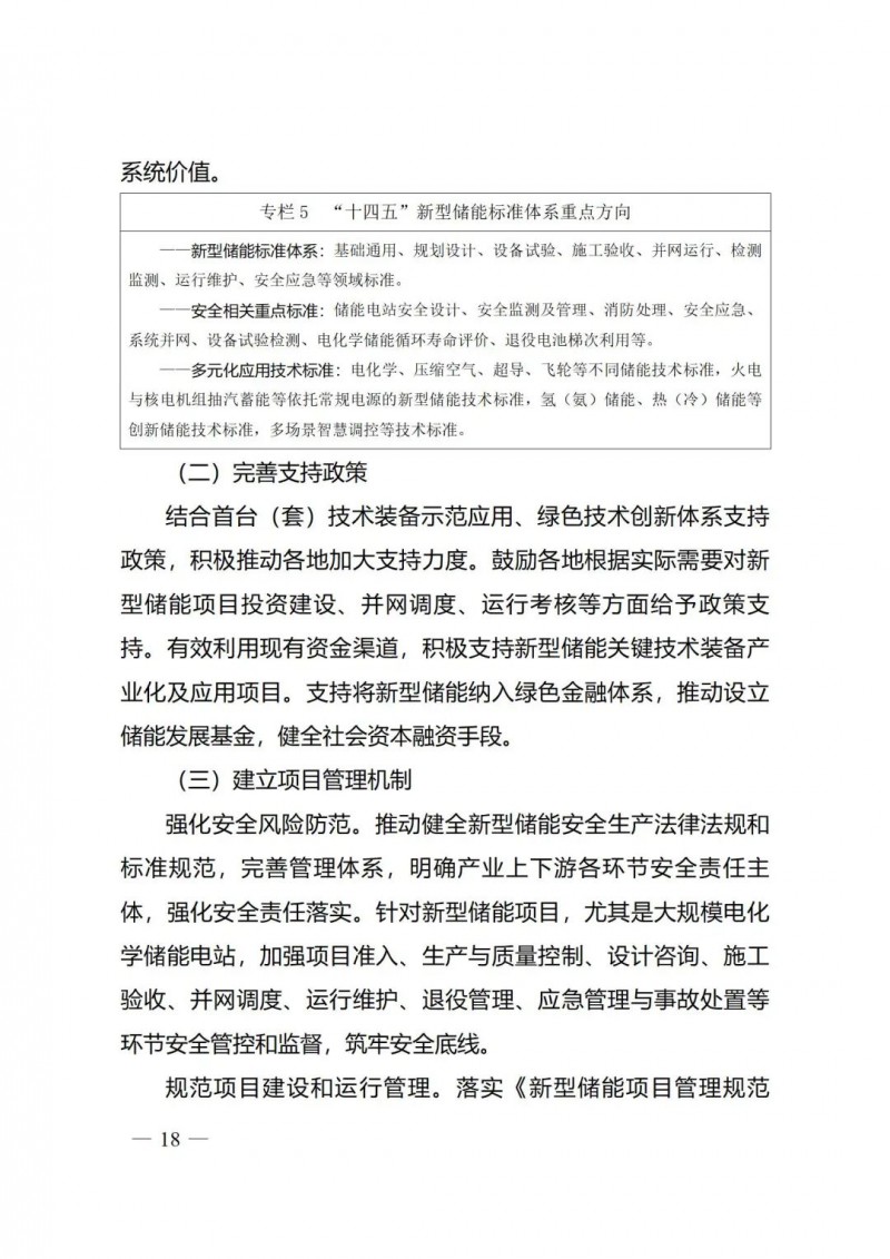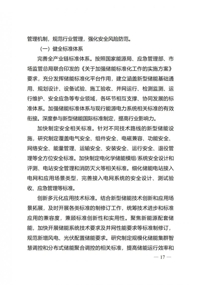 五是著力健全新型儲能管理體系?!秾嵤┓桨浮窂?qiáng)化標(biāo)準(zhǔn)的規(guī)范引領(lǐng)和安全保障作用,完善新型儲能全產(chǎn)業(yè)鏈標(biāo)準(zhǔn)體系,加快制定安全相關(guān)標(biāo)準(zhǔn),開展多元化應(yīng)用技術(shù)標(biāo)準(zhǔn)制修訂。要求加快建立新型儲能項目管理機(jī)制,規(guī)范行業(yè)管理,強(qiáng)化安全風(fēng)險防范。鼓勵各地加大新型儲能技術(shù)創(chuàng)新和項目建設(shè)支持力度,完善相關(guān)支持政策。加快建立新型儲能項目管理機(jī)制,強(qiáng)化安全風(fēng)險防范,規(guī)范項目建設(shè)和運行管理。