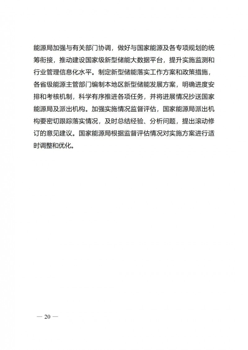 三)保障措施。為保障《實施方案》有效落地,提出系列具體保障措施。在協(xié)調(diào)保障方面,提出建立包含國家發(fā)展改革委、國家能源局與有關(guān)部門的多部門協(xié)調(diào)機(jī)制,做好與各項規(guī)模統(tǒng)籌銜接;在行業(yè)管理方面,提出建設(shè)國家級新型儲能大數(shù)據(jù)平臺,開展實施方案各項重點任務(wù)監(jiān)測,提升行業(yè)管理信息化水平;在責(zé)任落實方面,要求各省級能源主管部門編制新型儲能發(fā)展方案,明確各項任務(wù)進(jìn)度和考核機(jī)制。同時,國家能源局根據(jù)監(jiān)督評估情況,適時對實施方案進(jìn)行優(yōu)化調(diào)整。