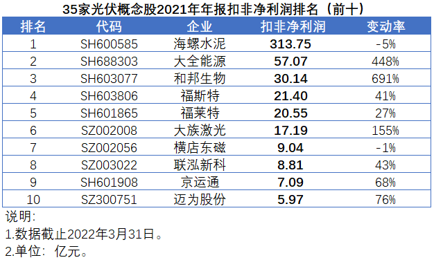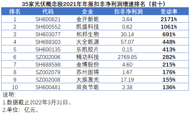 從業(yè)績增速來看,發(fā)電企業(yè)金開新能受益于光伏等新能源場站核準(zhǔn)裝機(jī)量同比增長129%以及2020年扣非凈利潤基數(shù)較低,業(yè)績暴漲2171%。二氧化硅生產(chǎn)商凱盛科技業(yè)績暴漲1061%。和邦生物、大全能源以及涉足光伏電池背板領(lǐng)域的樂凱膠片業(yè)績漲幅分別達(dá)到691%、448%和413%。其它企業(yè)中,精功科技、金博股份、蘇州固锝、大族激光、雙良節(jié)能業(yè)績漲幅在100%-300%之間。