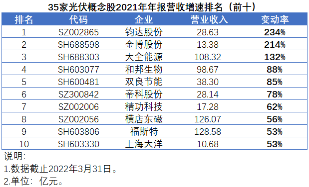 在光伏行業(yè)火熱的市場氛圍中,2022年已經(jīng)悄然走過了四分之一。在過去的三個(gè)月中,A股市場共有35家光伏概念股發(fā)布了2021年年報(bào),營收增速均值和中值分別為44%和37%,扣非凈利潤增速均值高達(dá)147%,不過中值僅為27%。