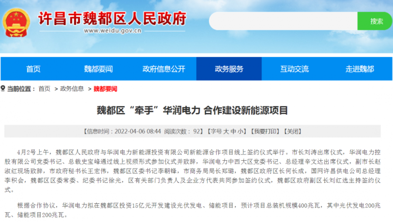 4月2號,河南許昌魏都區(qū)人民政府與華潤電力新能源投資有限公司新能源合作項目線上簽約儀式舉行。