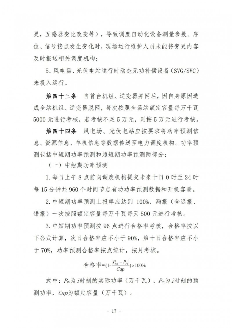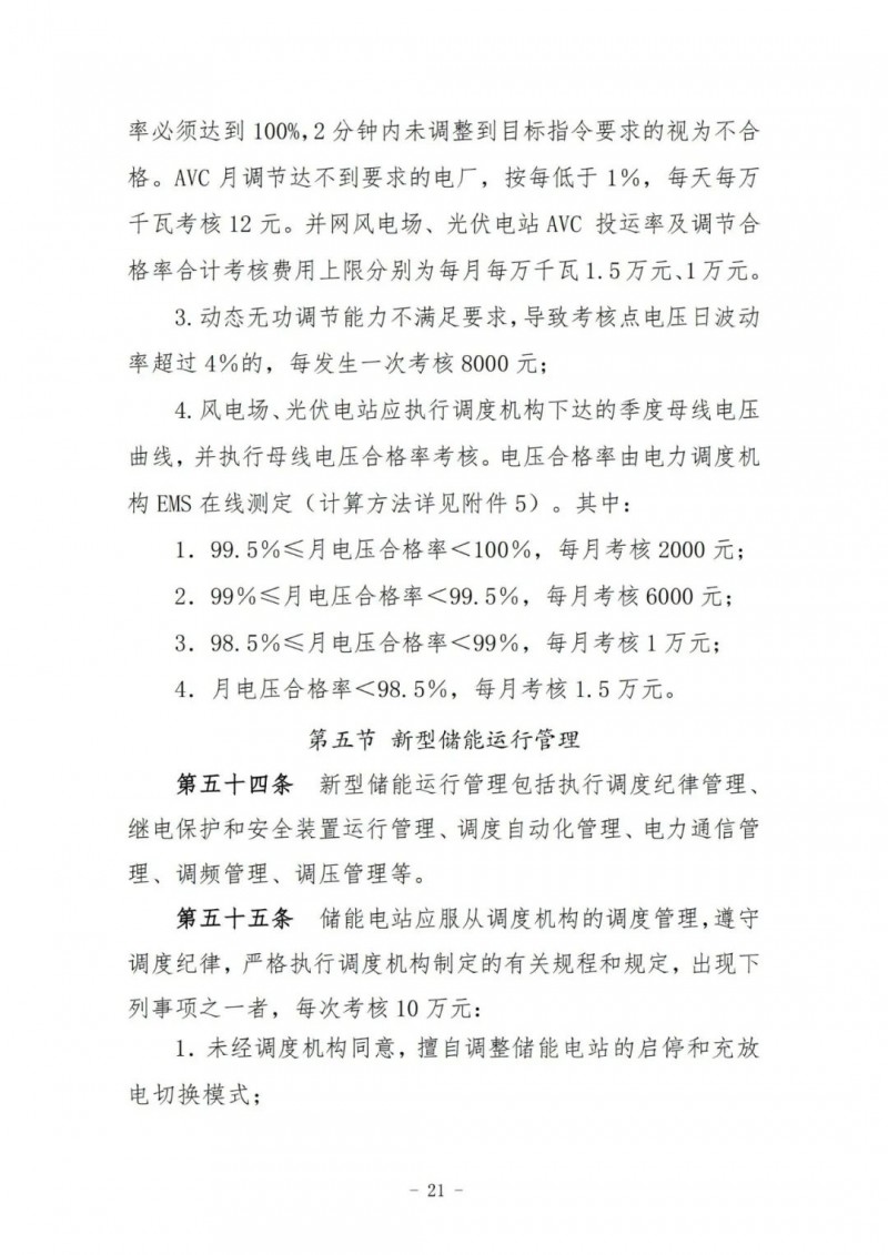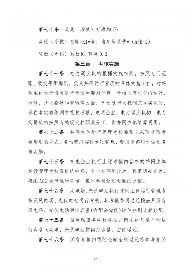 風(fēng)電場、光伏電站執(zhí)行并網(wǎng)主體運行管理考核及風(fēng)電場、光伏電站運行考核,其考核費用返還按當(dāng)月所有風(fēng)電場、光伏電站額定容量(含配套儲能)比例分別計算分配。