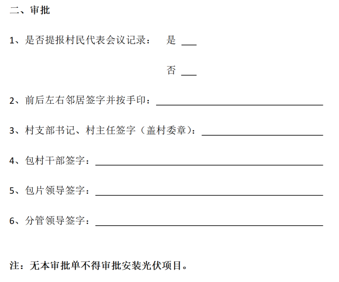 近日,山東地區(qū)某鄉(xiāng)鎮(zhèn)一位Y姓光伏從業(yè)者向索比光伏網(wǎng)爆料稱,當(dāng)?shù)厮泄夥?xiàng)目申報(bào)過程均需填寫《安裝方案審批單》。從他提供的截圖看,一個(gè)戶用光伏系統(tǒng)的安裝,在進(jìn)入當(dāng)?shù)毓╇娋种?,需?步才能完成: