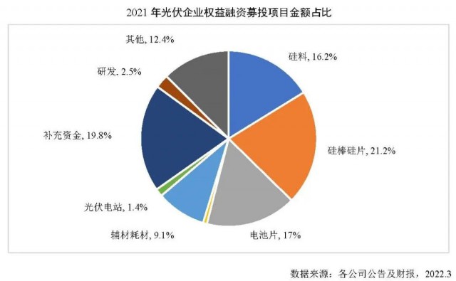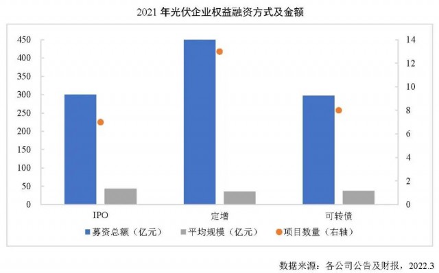 2021年我國光伏行業(yè)融資環(huán)境持續(xù)改善,共27家光伏企業(yè)在A股及港股資本市場使用權益融資方式募資,涉及權益融資項目28個,募資總額1058.33億元,同比增長48.2%。其中,再融資項目21個,募集資金758億元,同比增長30%;IPO上市融資項目7個,募集資金301億元,同比增長129.2%。截至2022年3月,2021年權益融資項目中,已完成融資合計700.77億元,同比增長16.3%。