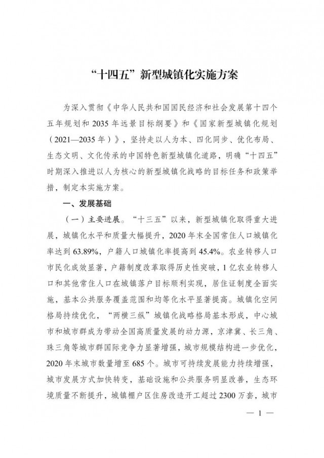 《“十四五”新型城鎮(zhèn)化實施方案》已經國務院批復同意(國函〔2022〕52號)?,F(xiàn)印發(fā)給你們,請結合實際認真貫徹落實。