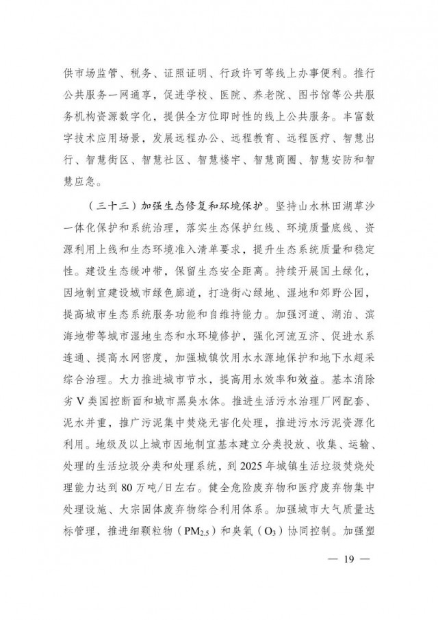 《方案》提出,到2025年,城市可持續(xù)發(fā)展能力明顯增強,城鎮(zhèn)開發(fā)邊界全面劃定,新增建設用地規(guī)模控制在2950萬畝以內,城市內澇治理取得明顯成效,城市燃氣等管道老化更新改造深入推進,能源資源利用效率大幅提升,城市黑臭水體基本消除,地級及以上城市空氣質量優(yōu)良天數(shù)比率提高到87.5%,城市建成區(qū)綠化覆蓋率超過43%。系統(tǒng)完備、科學規(guī)范、運行有效的城市治理體系基本建立,治理能力明顯增強。