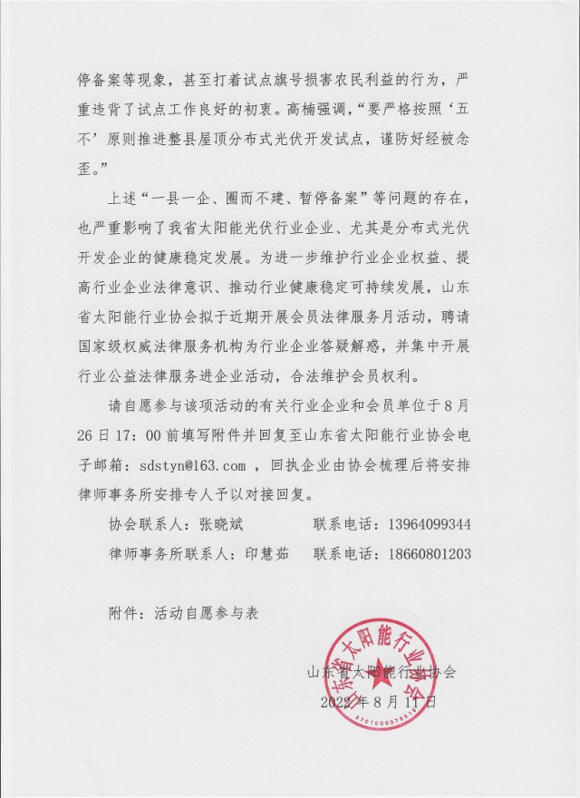 請自愿參與該項活動的有關(guān)行業(yè)企業(yè)和會員單位于8月26日17:00 前填寫附件并回復至山東省太陽能行業(yè)協(xié)會電子郵箱:sdstyn@163.com,回執(zhí)企業(yè)由協(xié)會梳理后將安排律師事務所安排專人予以對接回復。
