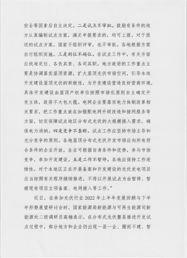啟動整縣(市、區(qū))推進屋頂分布式光伏開發(fā)試點工作,主要目的就是充分調(diào)動和發(fā)揮地方積極性,引導地方政府協(xié)調(diào)更多屋頂資源,進一步開拓市場,擴大屋頂分布式光伏的建設規(guī)模。去年,國家能源局提出“在開展整縣(市、區(qū))推進屋頂分布式光伏開發(fā)試點工作中需要著重把握以下五個方面:一是自愿不強制。各地是否開展試點以及開展多少個試點由各地根據(jù)自身實際情況自己決定,不搞行政命令。建筑屋頂是否開展建設,由屋頂產(chǎn)權(quán)單位綜合考慮屋頂承重、安全等因素后自主決定。二是試點不審批。鼓勵有條件的地方認真編制試點方案,滿足申報要求的,均可上報。對于報送的試點方案,國家不組織評審,也不審批。各地根據(jù)方案自行組織實施。三是到位不越位。在試點工作中,有關(guān)方面應找準定位、各負其責、各司其職。地方政府的工作重點主要是協(xié)調(diào)落實屋頂資源,擴大屋頂光伏市場空間,引導本地開發(fā)建設屋頂光伏的積極性,為開發(fā)建設營造良好營商環(huán)境,具體開發(fā)建設由屋頂產(chǎn)權(quán)單位按照市場化原則自主確定開發(fā)主體,政府不大包大攬。電網(wǎng)企業(yè)要落實電力體制改革相關(guān)要求,把工作重點放在加強配電網(wǎng)升級改造和接網(wǎng)服務等方面,切實保障試點地區(qū)分布式光伏的大規(guī)模接入需求,確保電力消納。四是競爭不壟斷。試點工作應堅持市場主導和充分競爭的原則。各地屋頂分布式光伏開發(fā)市場應向所有符合條件的企業(yè)開放,企業(yè)可根據(jù)自身條件和優(yōu)勢,參與市場競爭,參加開發(fā)建設。五是工作不暫停。各地應保持工作連續(xù)性,對于本地區(qū)正在開展備案和開發(fā)建設的光伏發(fā)電項目應當按照有關(guān)程序繼續(xù)推進,不得以開展試點為由暫停、暫緩現(xiàn)有項目立項備案、電網(wǎng)接入等工作?!?/p>