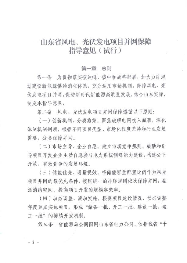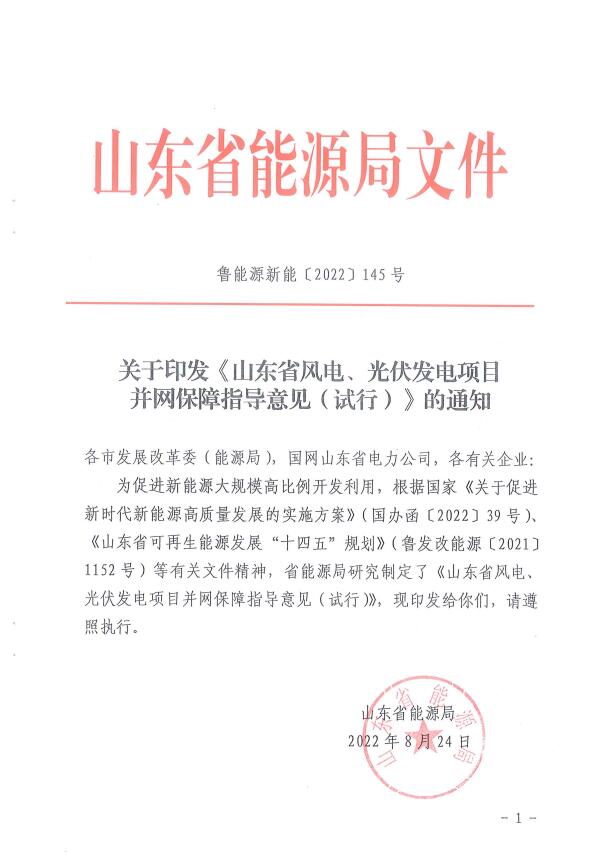 為促進新能源大規(guī)模高比例開發(fā)利用,根據(jù)國家《關(guān)于促進新時代新能源高質(zhì)量發(fā)展的實施方案》(國辦函〔2022〕39號)《山東省可再生能源發(fā)展“十四五”規(guī)劃》(魯發(fā)改能源〔2021〕1152號)等有關(guān)文件精神,省能源局研究制定了《山東省風電、光伏發(fā)電項目并網(wǎng)保障指導意見(試行)》,現(xiàn)印發(fā)給你們,請遵照執(zhí)行。