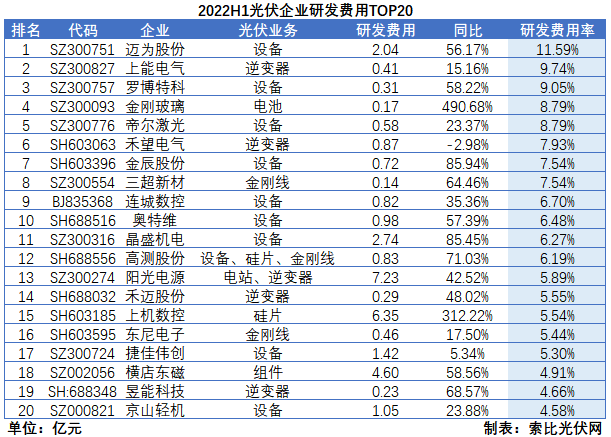 當(dāng)然,N型電池技術(shù)之所以能夠不斷取得突破性進(jìn)展,離不開生產(chǎn)設(shè)備的持續(xù)升級與迭代。在研發(fā)費(fèi)用率排名中,前20位中有10家是設(shè)備廠商,其中HJT設(shè)備龍頭邁為股份的研發(fā)費(fèi)用率更是高達(dá)11.59%。在近期的中報(bào)業(yè)績交流會中,邁為股份表示預(yù)計(jì)今年下半年HJT組件成本能夠與PERC組件持平,至2023年HJT電池片成本優(yōu)勢將會逐步顯現(xiàn)。