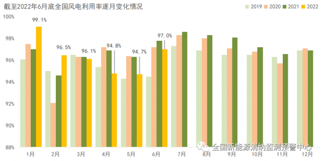 截至6月底全國(guó)風(fēng)電利用率逐月變化情況