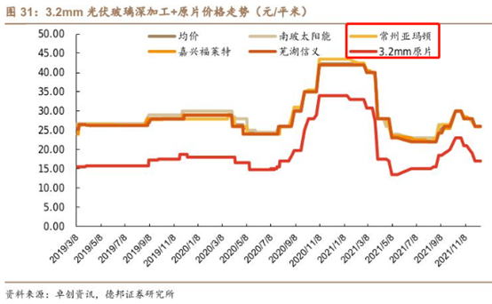 以3.2mm光伏玻璃為例。過(guò)去幾年,剔除異常波動(dòng)年份,加工后的光伏玻璃價(jià)格基本在25元/平米左右,原片價(jià)格約為15元/平米。價(jià)差10元/平米。