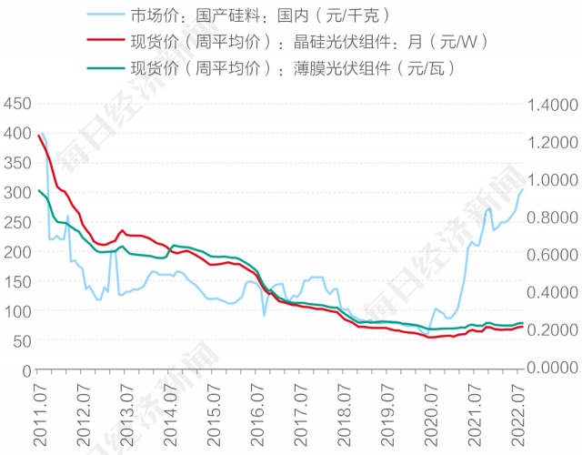 2011年7月開始下行以來,至2022年7月國產(chǎn)硅料價(jià)格走出一條V形線,11年過去,還未達(dá)到當(dāng)時(shí)的價(jià)格水平 圖片來源:每經(jīng)記者 劉國梅 制圖