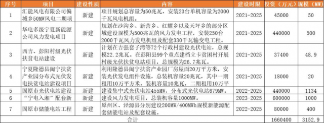 近期,固原市人民政府辦公室印發(fā)固原市自然資源保護和利用“十四五”規(guī)劃的通知。根據(jù)光伏們查詢,在固原市自然資源保護和利用“十四五”規(guī)劃建設項目庫中,有關(guān)清潔能源產(chǎn)業(yè)的項目共10個。其中包括光伏、風電、儲能的項目共7個,合計新能源新建規(guī)模3152.9MW,總投資金額166億元。具體項目名單如下: