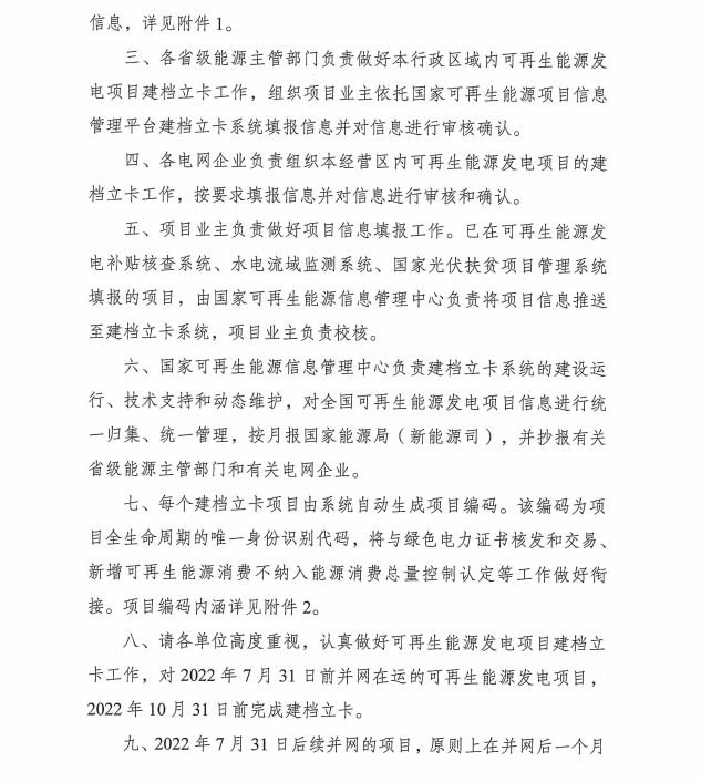 對2022年7月31 日前并網(wǎng)在運的可再生能源發(fā)電項目,2022 年10月31日前完成建檔立卡。