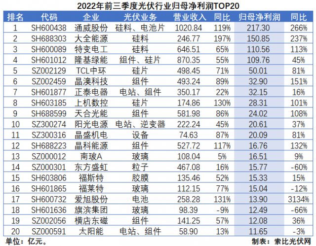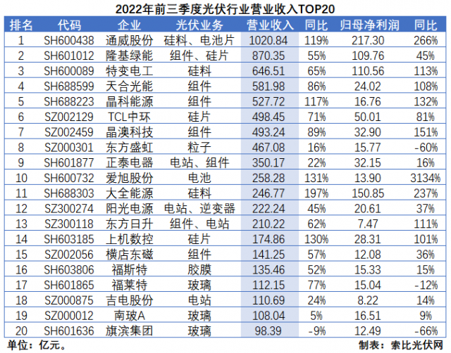 從營收規(guī)模來看,硅料和組件依然是創(chuàng)收能力最強(qiáng)的環(huán)節(jié)。而且,多數(shù)企業(yè)前三季度營業(yè)收入均已超過2021年全年,且創(chuàng)歷史新高。其中,通威股份營收規(guī)模首次突破千億大關(guān),達(dá)到1021億元;隆基綠能二、三季度邊際改善顯著,環(huán)比增速分別達(dá)到71%和15%,營收規(guī)模達(dá)到870.35億元;特變電工受益于硅料、煤炭產(chǎn)品的“量價(jià)齊升”,達(dá)到646.51億元。