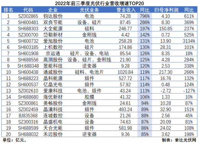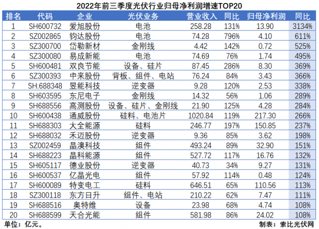 2022年前三季度,在整個A股市場一片“哀嚎”之際,光伏行業(yè)依然延續(xù)高速增長態(tài)勢。根據(jù)索比光伏網(wǎng)的統(tǒng)計(jì)數(shù)據(jù)顯示,80家光伏概念股營收增速和歸母凈利潤增速中值分別達(dá)到51%和40%;營業(yè)收入和歸母凈利潤呈增長態(tài)勢的企業(yè)分別達(dá)到71家和57家,占比高達(dá)89%和71%。