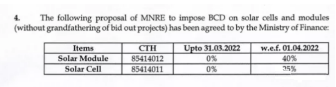 印度太陽能制造商協(xié)會(huì)(ISMA)請(qǐng)?jiān)柑岢龊?,印度政府?022年4月1日起對(duì)光伏電池和組件分別征收25%和40%的基本關(guān)稅,征收的關(guān)稅涵蓋了被調(diào)查產(chǎn)品的整個(gè)范圍,一定程度上緩解了印度本土光伏行業(yè)的價(jià)格壓力。