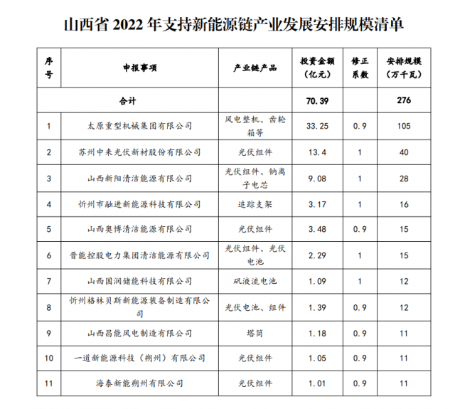 12月6日,山西省能源局公布《2022年支持新能源產(chǎn)業(yè)發(fā)展風(fēng)電光伏發(fā)電建設(shè)規(guī)模評(píng)審結(jié)果》,規(guī)模共計(jì)3.72GW,其中新能源產(chǎn)業(yè)鏈企業(yè)11個(gè)家,總投資額達(dá)70.39億元,安排規(guī)模2.76GW;煤電調(diào)峰能力建設(shè)企業(yè)6家,安排0.96GW。
