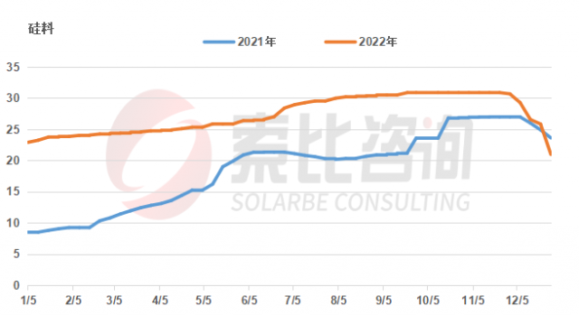 據(jù)索比咨詢統(tǒng)計,2022年的前11個月,多晶硅一直延續(xù)之前的上漲態(tài)勢。以單晶致密料為例,從年初的22.91萬元/噸開始不斷上漲,最高達到30.88萬元/噸,且保持較長時間(9月-11月),直到11月底出現(xiàn)試探性下跌,并在12月出現(xiàn)快速下降,目前致密料已降至20.98萬元/噸,菜花料僅18.97萬元/噸,且仍有繼續(xù)走低之勢。