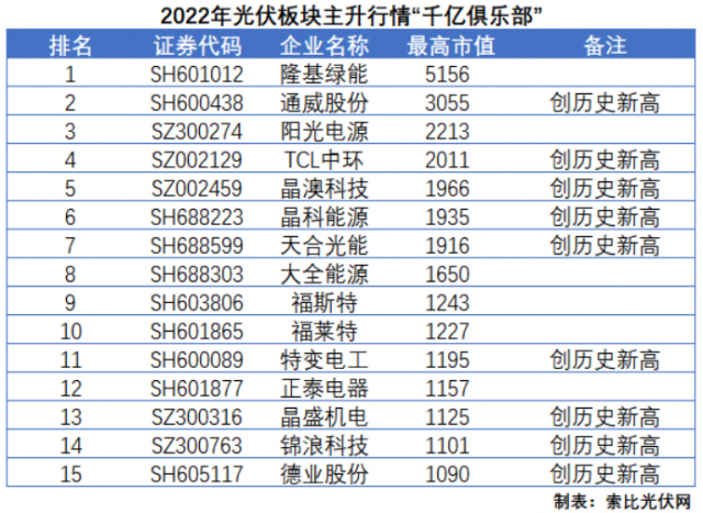 根據(jù)索比光伏網(wǎng)的統(tǒng)計,88家光伏概念股主升行情平均漲幅(中值,下同)高達131%,其中次新、電池片、逆變器企業(yè)漲幅居前。值得一提的是,年內(nèi)“光伏千億俱樂部”擴容至15家,其中通威股份和TCL中環(huán)總市值歷史首次突破3000億和2000億大關。